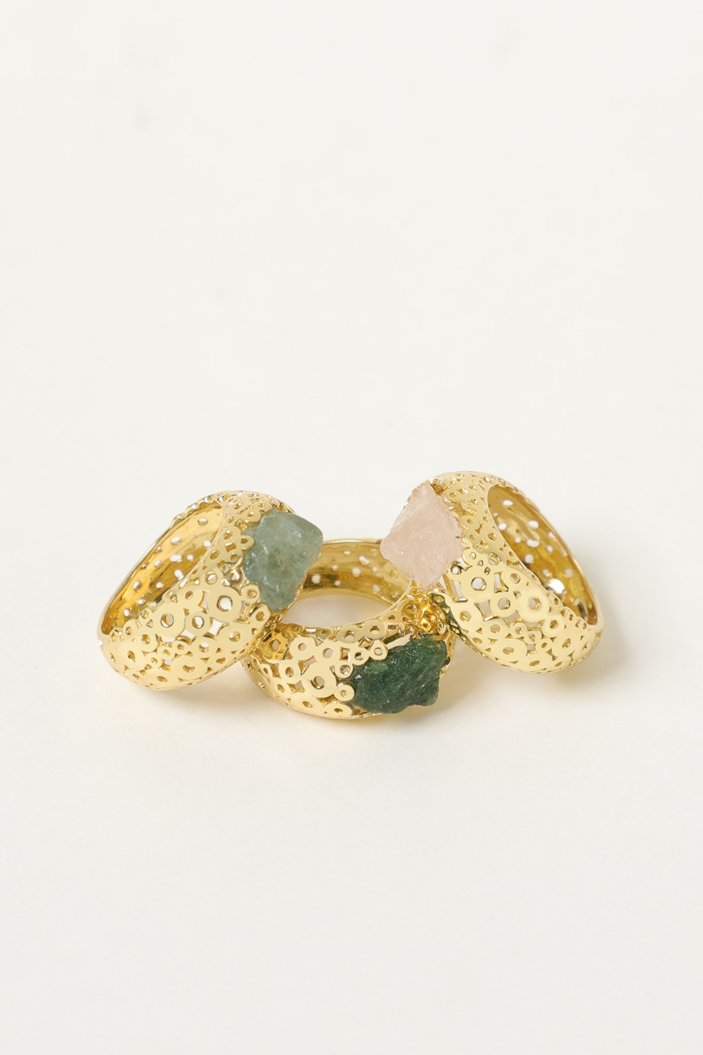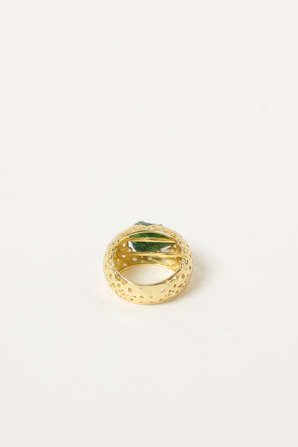 Anello a fascia traforata in ottone arricchito da una pietra grezza in grado di offrire un carattere di unicità al gioiello.
