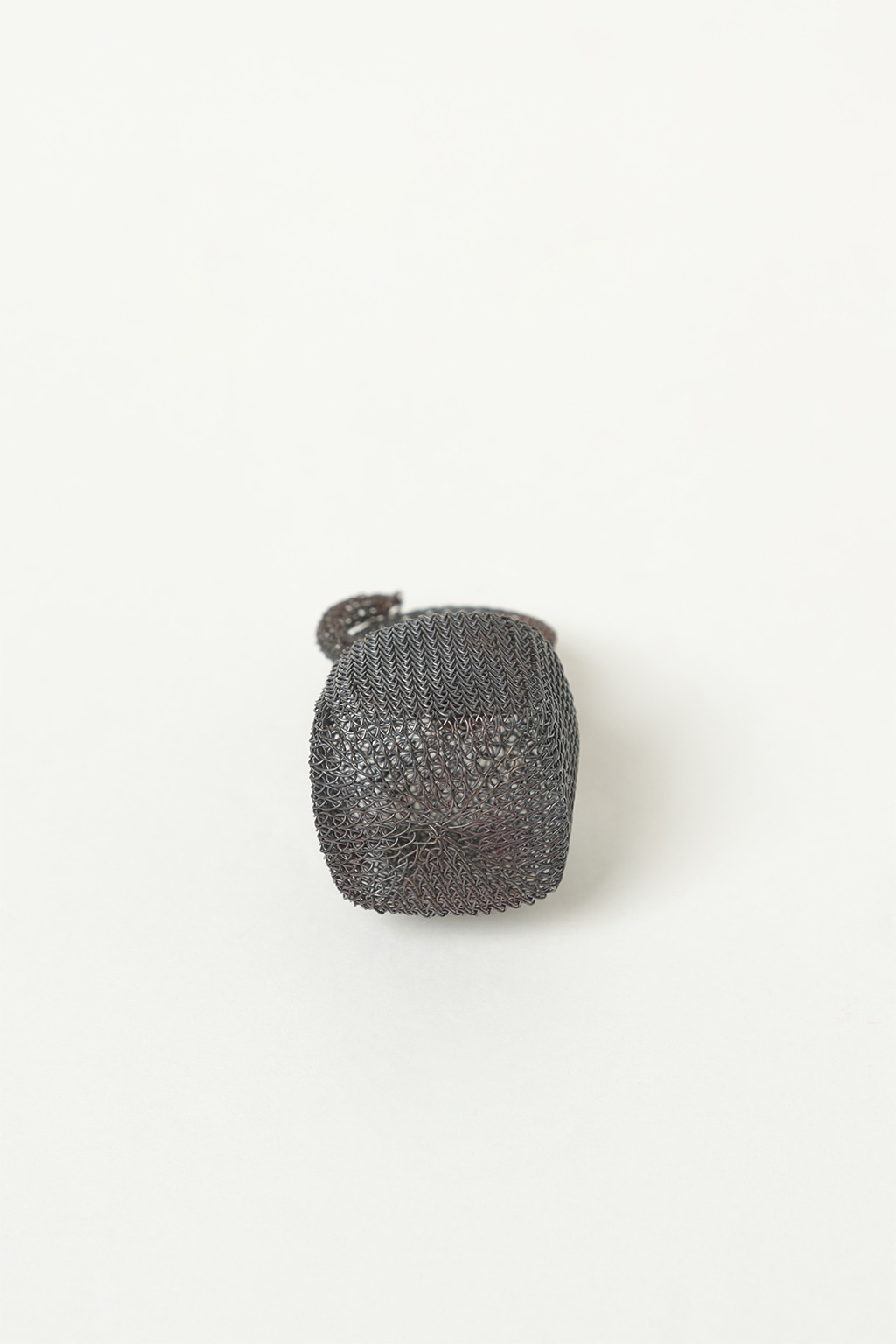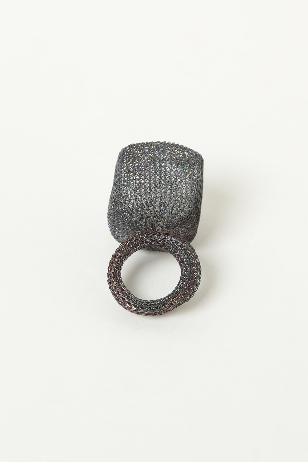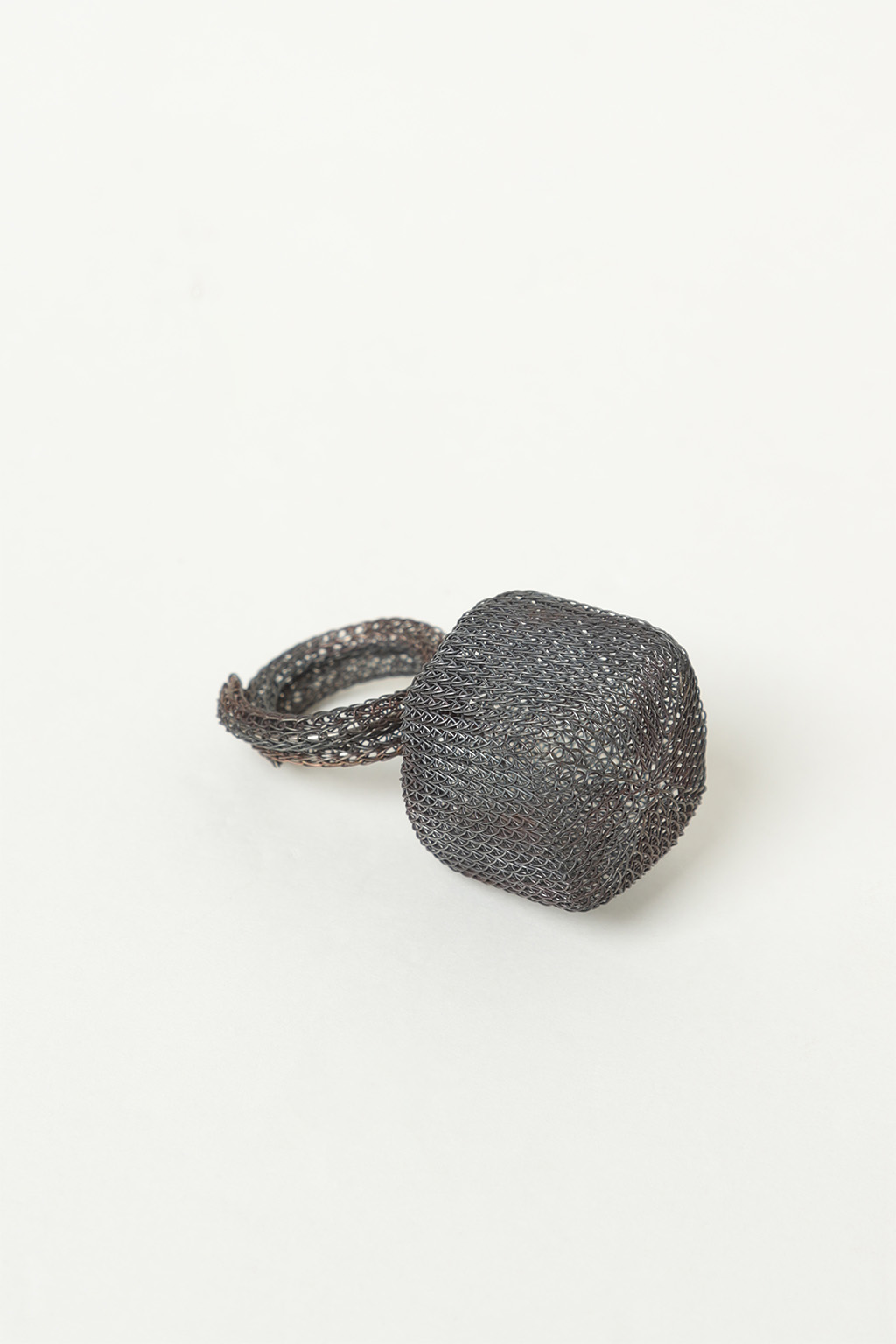 Anello di forma cubica cucito a mano con un filo di acciaio ossidato.